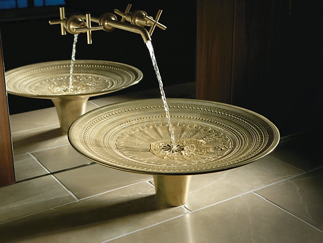 Вдохновленная древнем искусством Юго-Восточной Азии, раковина Kohler Kamala накладная на столешницу, покрыта сложным рельефным узором из точек, гребней и завитков.